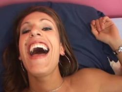 Das geile Weib mit den handlichen Möpsen wird mit dem Strap on in die feuchte Fotze gepoppt