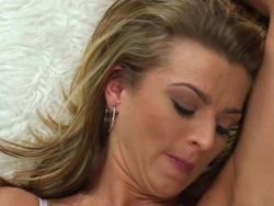 Blonde Schlampe mit kleinen Brüsten reibt sich die Möse