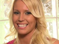 Versaute blondhaarige Frau mit megapralle Busen beim Stöhnen