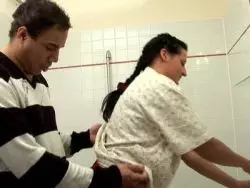 Eine blonde Milf lutscht einem jungen Typ den Schwanz